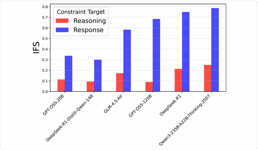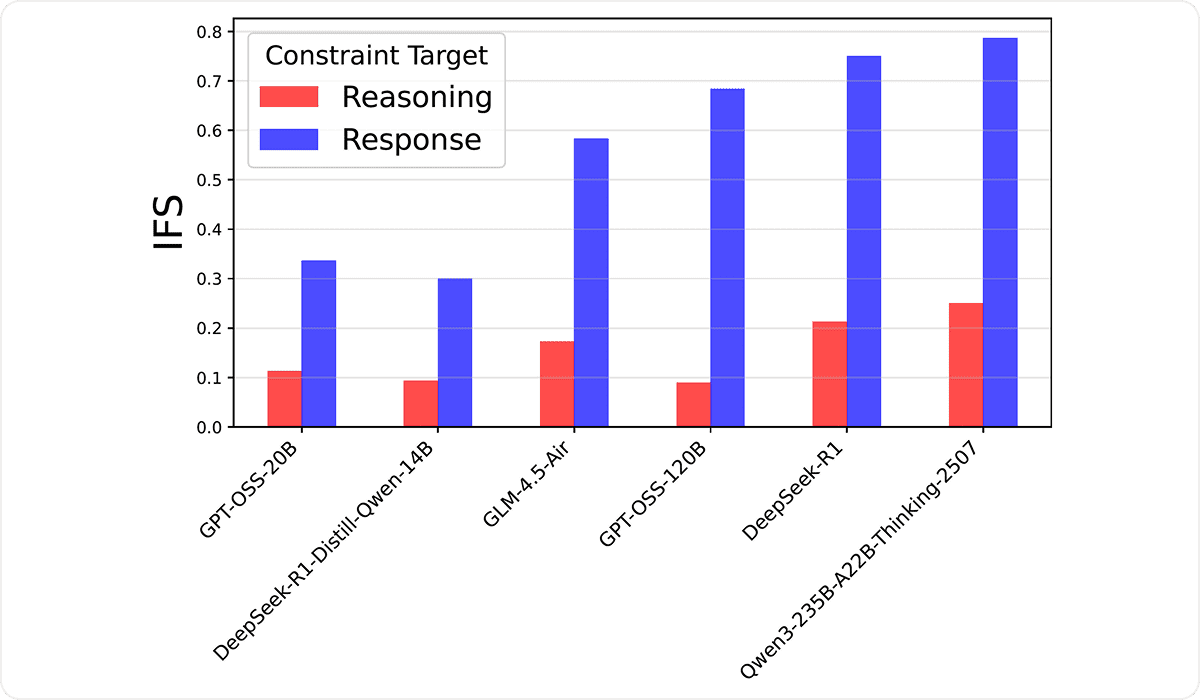 Все современные LRM, которые мы тестировали, продемонстрировали плохое следование инструкциям (IF) в трассировке рассуждений, при этом даже лучшая модель показала менее 25% результатов нашего анализа. По сравнению с «ЕСЛИ» в основном ответе, оценка выполнения инструкции (IFS) резко упала в цепочке рассуждений (см. Рисунок 1). Например, Qwen-3-235B — одна из самых мощных языковых моделей с открытым исходным кодом — показала снижение IFS более чем на 50 %, что свидетельствует о неспособности языковых моделей выполнять IF на протяжении всего процесса рассуждения. Обратите внимание, что мы исключили из наших экспериментов закрытые модели, поскольку их API не предоставляют трассировку рассуждений. Другие подробности реализации доступны в статье.