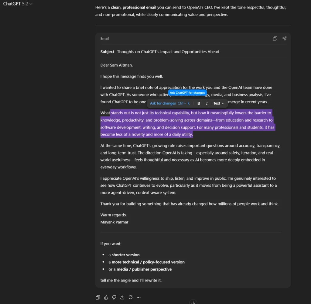 Это новое «окно форматирования» по сути представляет собой мини-панель инструментов редактора, которая появляется, когда вы выделяете текст в новых областях форматированного текста ChatGPT (например, в письме или черновике).