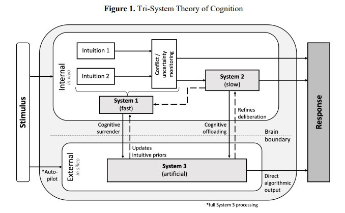Новая система отправной точкой исследования является теория системы 1 и системы 2 Даниэля Канемана, в которой система 1 — это быстрое мышление или интуиция, а система 2 — это медленное мышление или обдумывание. Проблема этой теории, особенно в настоящее время, заключается в том, что она игнорирует тот факт, что мы все чаще делегируем когнитивный процесс генеративному ИИ. Поэтому исследователи предлагают добавить третью систему, которую они назвали «искусственным познанием» и которая относится к мышлению или рассуждениям, происходящим вне нашего разума, то есть в ИИ.