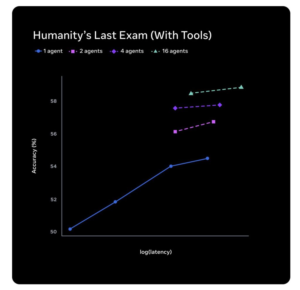 График задержки, опубликованный Meta, наглядно иллюстрирует это: с 16 агентами, работающими параллельно, точность последнего экзамена по гуманитарным наукам достигает почти 59% при задержке, сопоставимой с задержкой одного агента в расширенном режиме. Это похоже на разницу между одним экспертом, работающим сверхурочно, и комитетом экспертов, проводящим обсуждения одновременно. Результат не только лучше, он приходит раньше. Это особенно важно в тех случаях, когда пользователь не может ждать ответа несколько минут.
