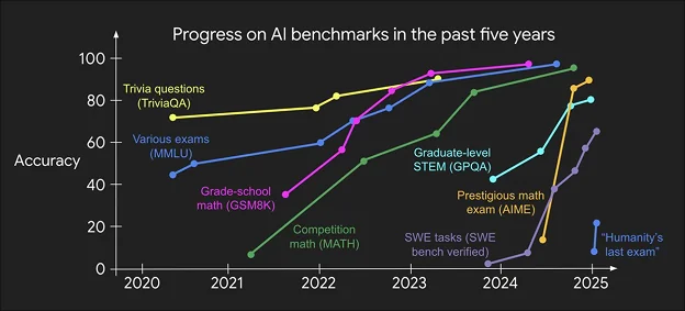 Тенденция ускоряется, как видно на графике выше. Если моделям потребовалось почти четыре года, чтобы достичь высокой производительности на MMLU, то новые тесты, такие как GPQA (вопросы для докторантов), показали стремительный рост всего за год. Это ускорение отражает беспрецедентные темпы развития ИИ, которые мы наблюдаем, и подчёркивает важность всё более сложных тестов, которые помогают нам выбирать лучшие модели.