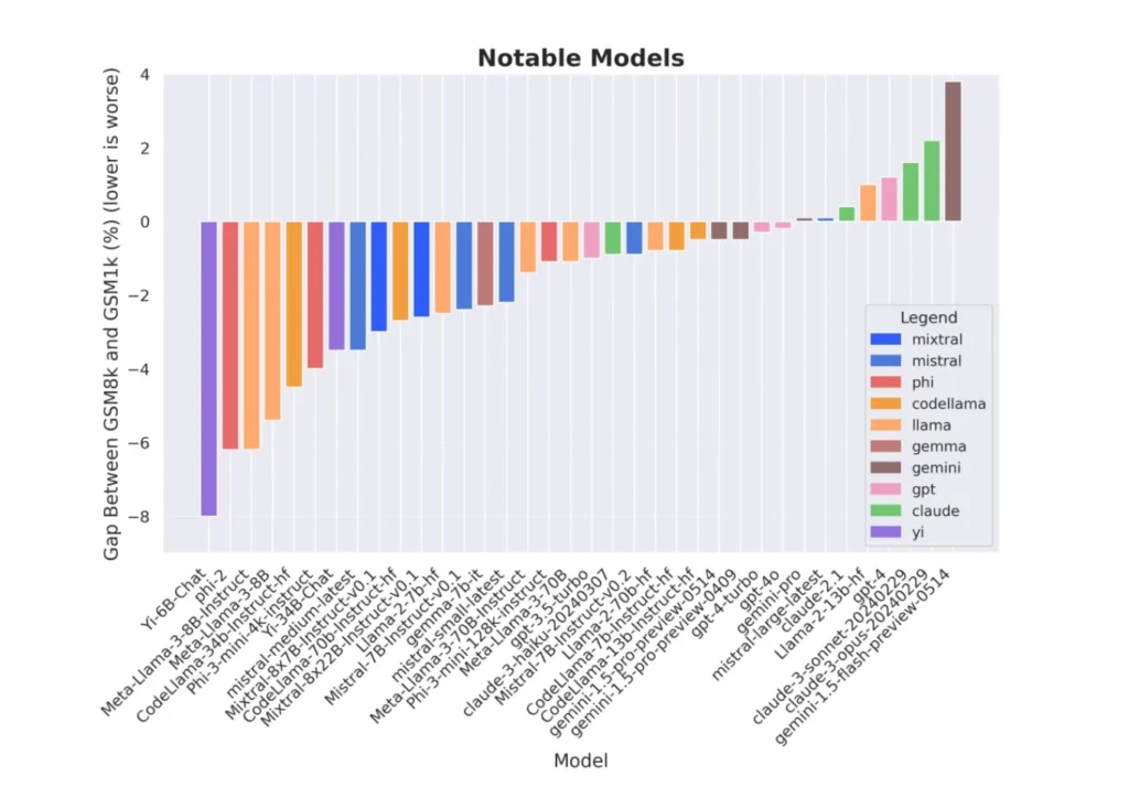 Сравнение GSM8K и GSM1K прекрасно иллюстрирует эту проблему. GSM8K — это широко используемый набор математических задач, а GSM1K содержит аналогичные задачи, которые гарантированно являются новыми. Когда исследователи сравнили эффективность моделей на обоих наборах задач, они обнаружили, что многие модели набрали значительно меньше баллов на GSM1K. Это позволяет предположить, что высокие баллы на GSM8K могут частично отражать способность к запоминанию, а не к подлинному математическому мышлению.
