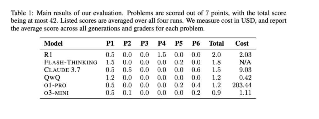 Эта проблема становится ещё более очевидной, если обратить внимание на искажение данных в тестах по математике. Когда модели SoTA были протестированы на математической олимпиаде в США (USAMO 2025) через несколько часов после её проведения (чтобы полностью исключить возможность искажения данных), даже лучшие на тот момент модели показали ужасающие результаты — менее 5%!