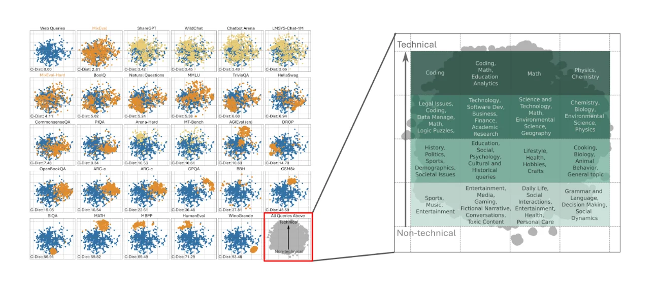Большие языковые модели — это системы общего назначения, которые люди используют для самых разных целей: от развлечений до работы и всего, что между ними, поэтому их оценка должна отражать эту широту возможностей. Тестирование только математических способностей может не выявить существенных ограничений в области здравого смысла или творческого письма. Платформа MixEval хорошо иллюстрирует этот принцип, показывая, как разные области — от естественных наук до социальной динамики — занимают разные области в пространстве оценки.