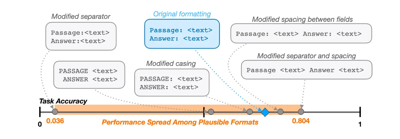 Когда исследователи из разных организаций применили эти подходы, они получили разные результаты и оценки моделей. Это видно на приведённой ниже диаграмме, которая показывает высокую вариативность производительности при, казалось бы, незначительных изменениях входных данных. Такое несоответствие вызывает беспокойство, поскольку оно означает, что выводы о возможностях модели могут зависеть от особенностей реализации, а не от реальных различий в производительности.