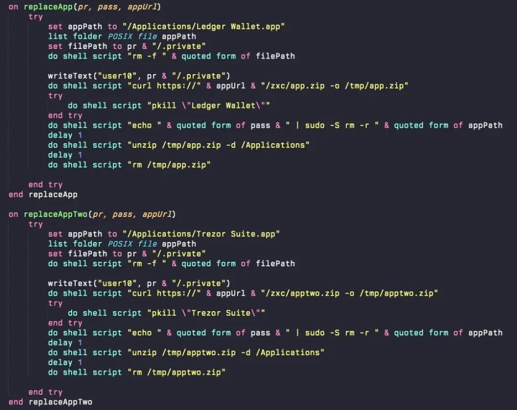 AMOS сохраняется в /Users/$USER/ в виде скрытого файла (.helper). При запуске он сканирует папку с приложениями на наличие Ledger Wallet и Trezor Suite. Если они найдены, он перезаписывает их троянизированными версиями, которые предлагают жертве ввести начальную фразу «в целях безопасности».