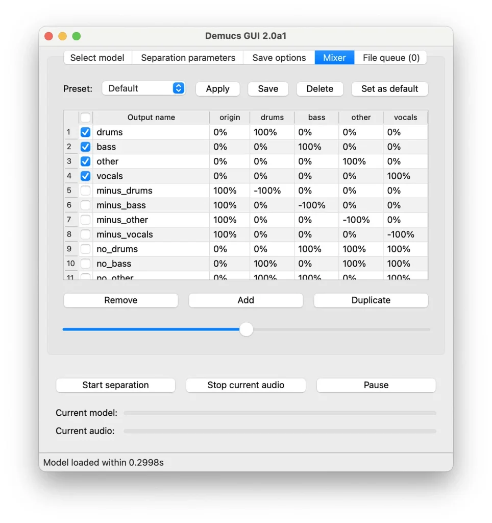 Demucs позволяет вам выбирать, какие треки вы хотите разделить. Обычно я предпочитаю разделять музыку и вокал.