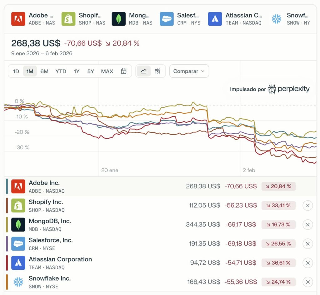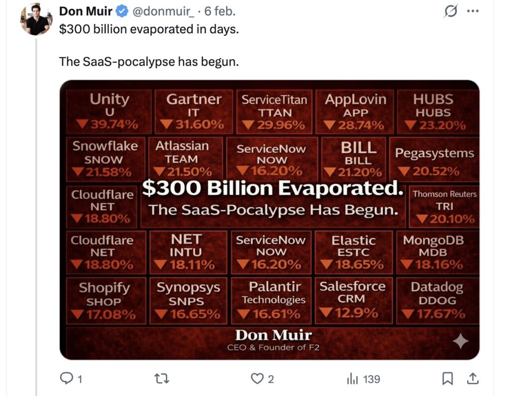 Но ИИ, похоже, угрожает этой модели. на прошлой неделе компании-разработчики программного обеспечения в одночасье потеряли на фондовом рынке в общей сложности 300 миллиардов долларов. Акции MongoDB, Salesforce, Shopify или Atlassian потеряли в цене от 15 до 20% за несколько часов, и начались разговоры о «SaaS-апокалипсисе» («Сааспокалипсис«).